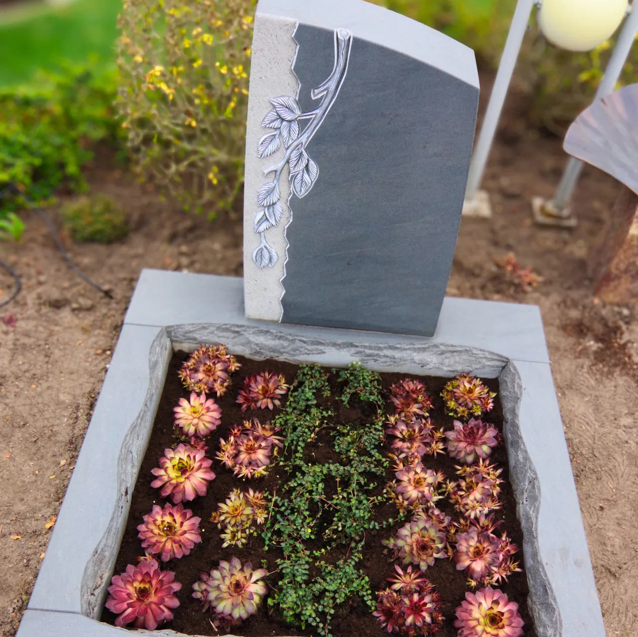Grabstein: Bohemian Grey, satiniert und handwerklich mit einen Ast mit Blättern bearbeitet.