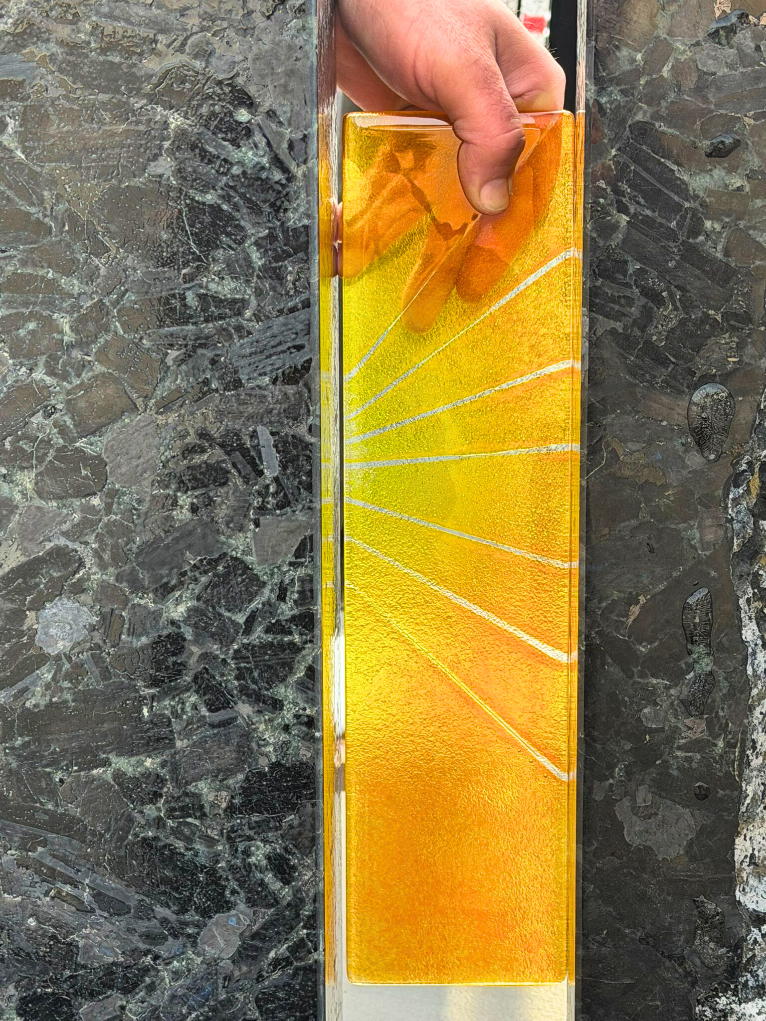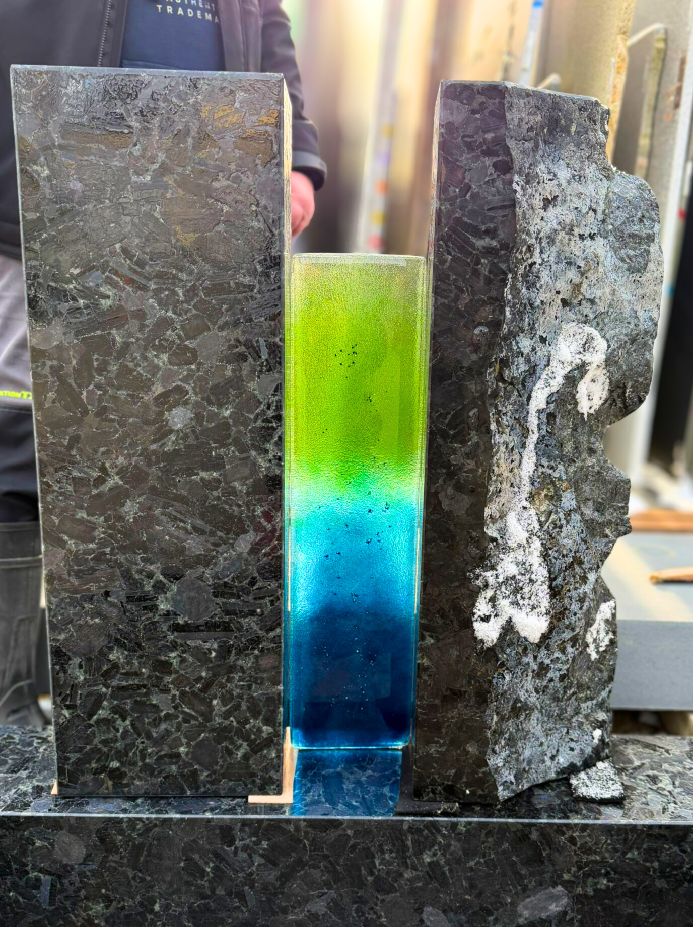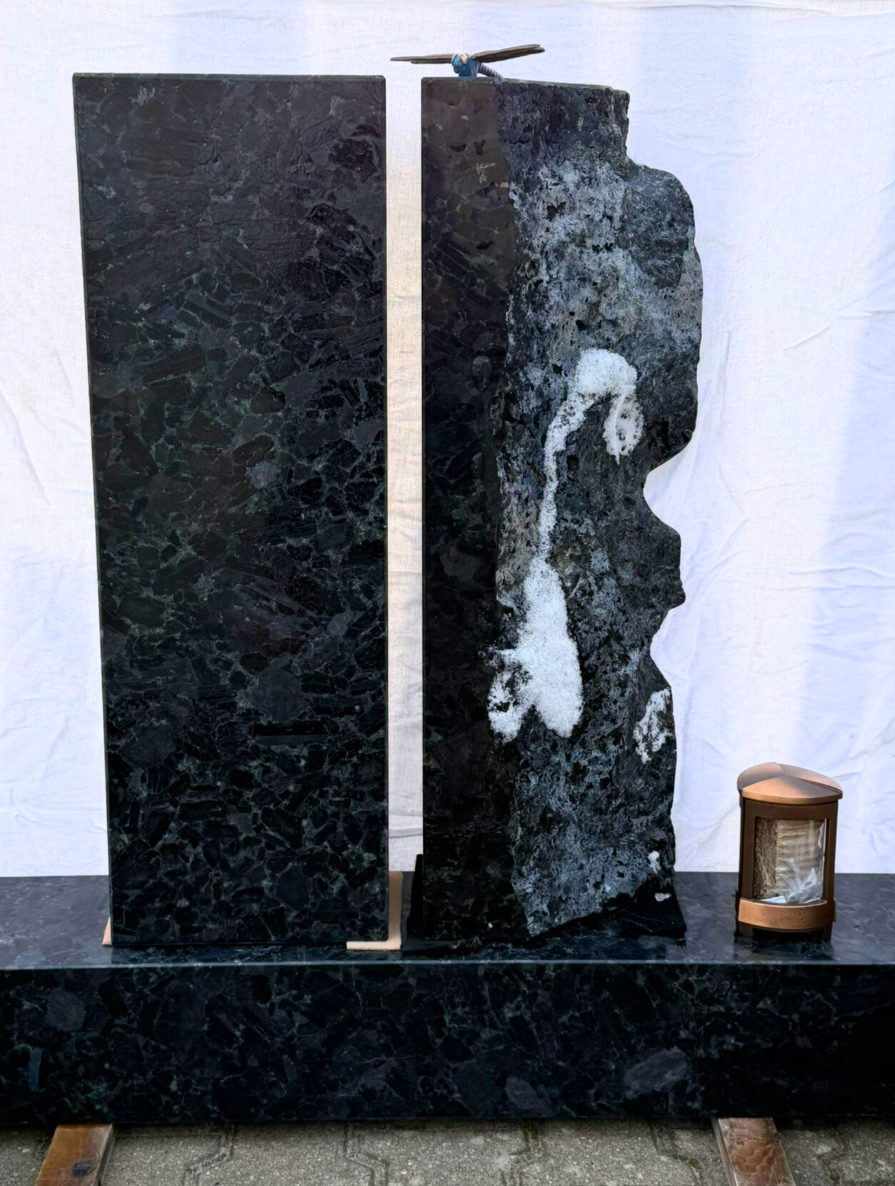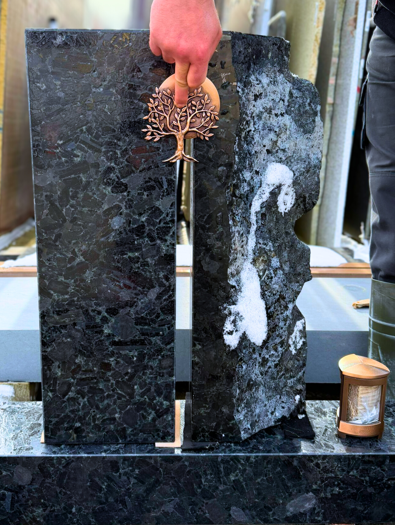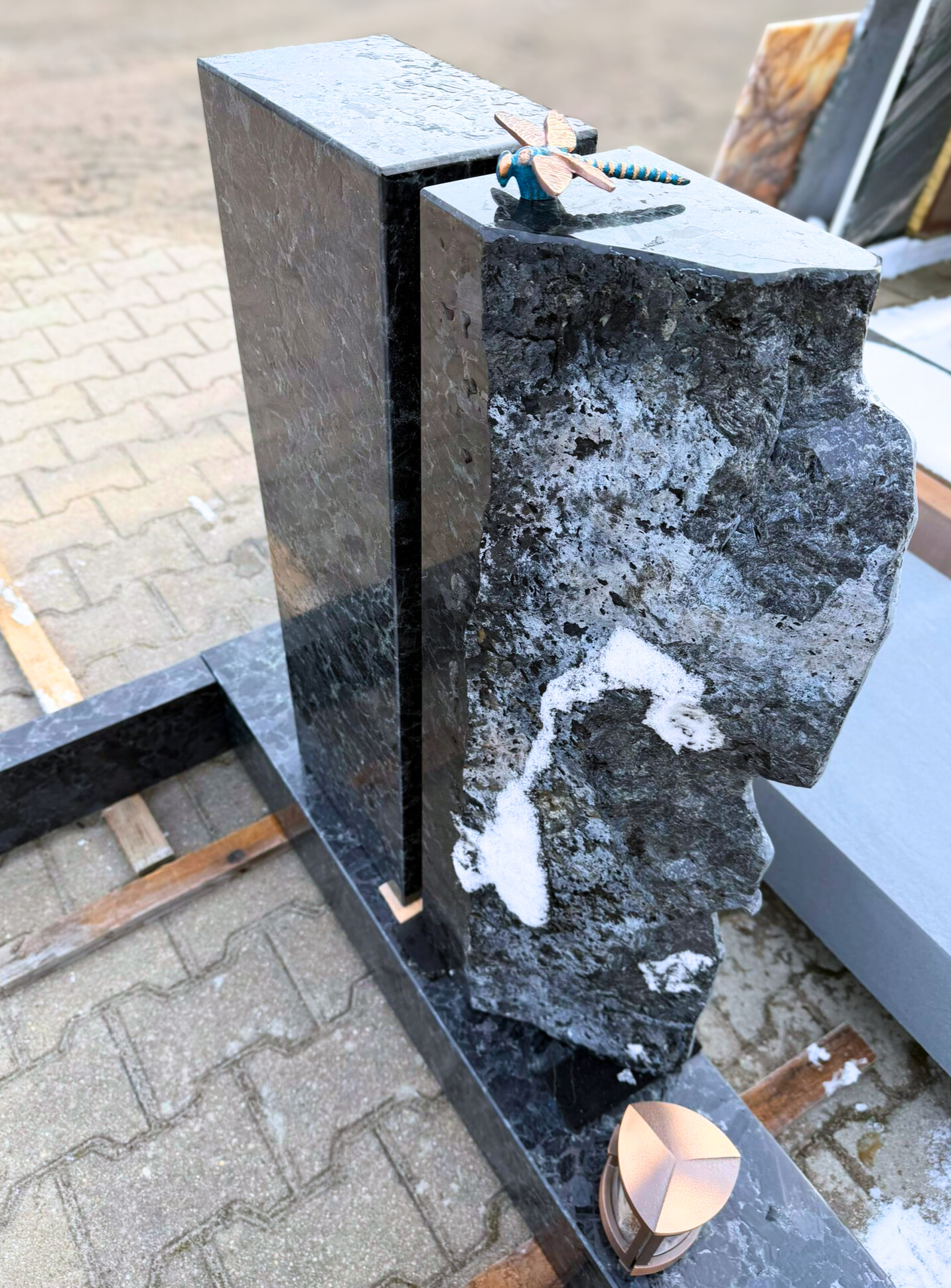 Wie auf den Bildern zu sehen, lässt der Raum zwischen Stele und dem Bruchstück mehrere Gestaltungsmöglichkeiten zu. Verschiedenfarbige Glaselemente bieten sich an, die einen schönen Kontrast zu dem schwarzen Stein bilden. Ebenso könnte eine Ornamentik, wie eine Blume, ein Kreuz oder ein Strauch, die beiden Steine verbinden.