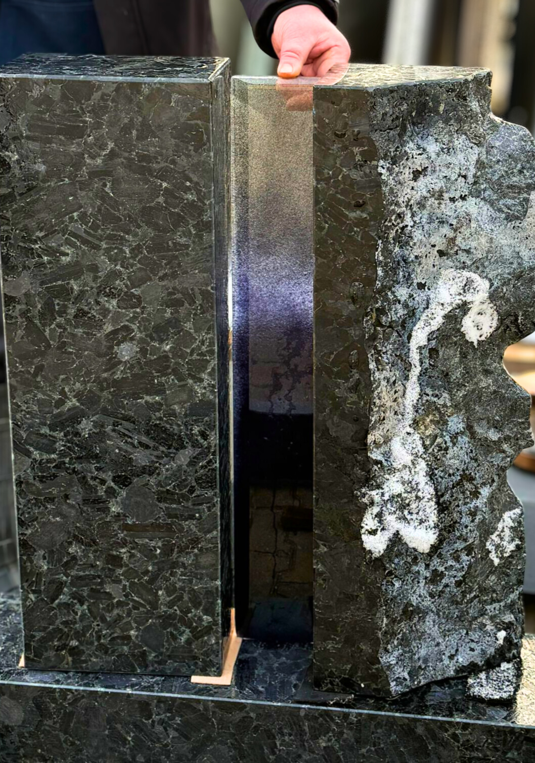 Für den Entwurf unserer Urnengrabanlage ist eine Stele geschnitten worden, die neben einem Bruchstück aus der Tranche des Wolga Blue platziert wird. Das Bruchstück ist deshalb so interessant, weil es eine weiße Quarzstruktur enthält, die dieser Grabmalanlage ein einzigartiges Design verleiht.