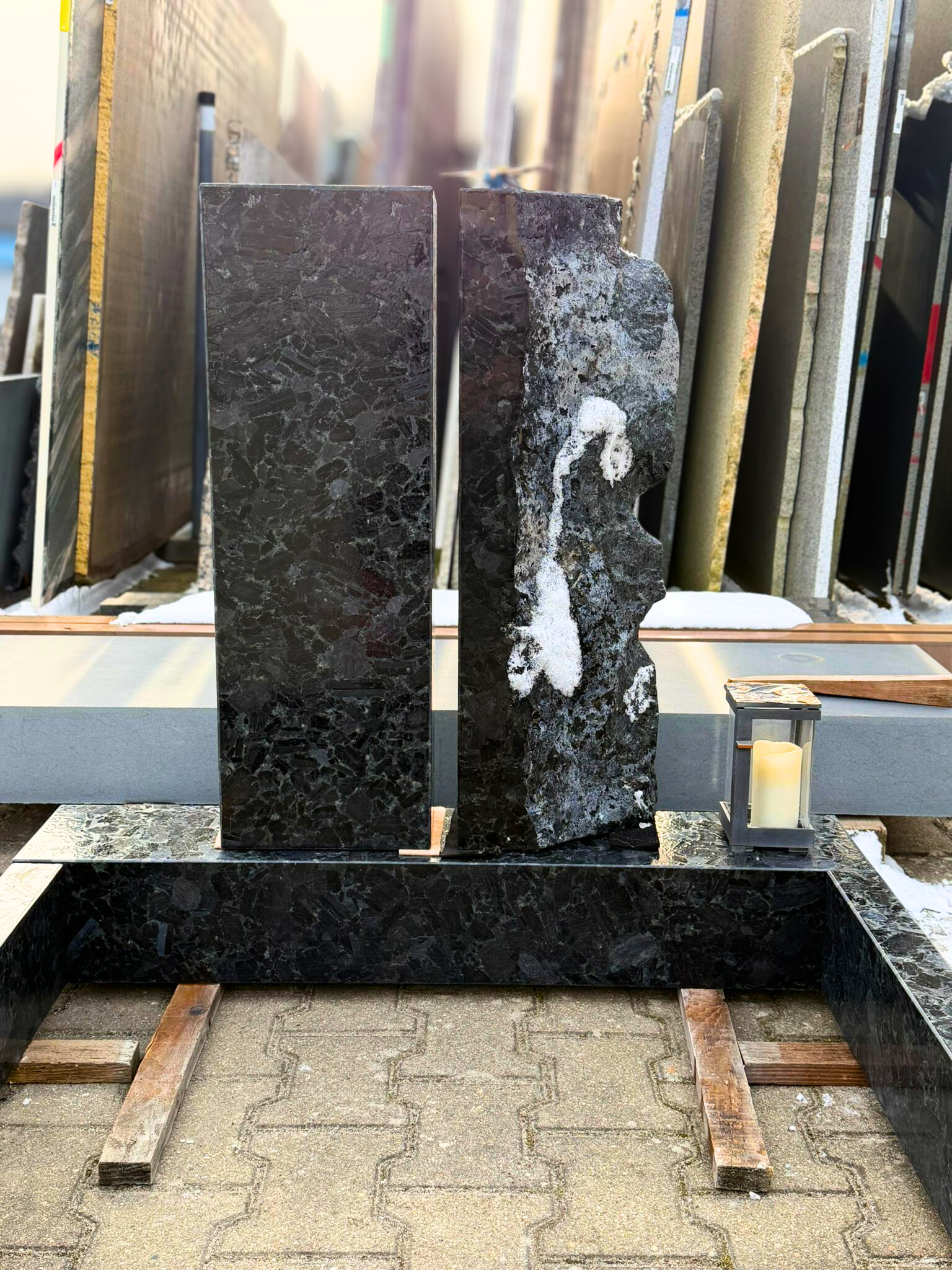 Der aus der Ukraine stammende Naturstein „Wolga Blue“ mit seiner edlen Optik und seiner besonderen grauschwarzen Färbung wird hier zu einer Urnengrabanlage mit Einfassung verarbeitet. Die charakteristische Struktur des Steins sind seine leuchtend blauen Einschlüsse, die dem Wolga Blue seine Einzigartigkeit verleihen.
