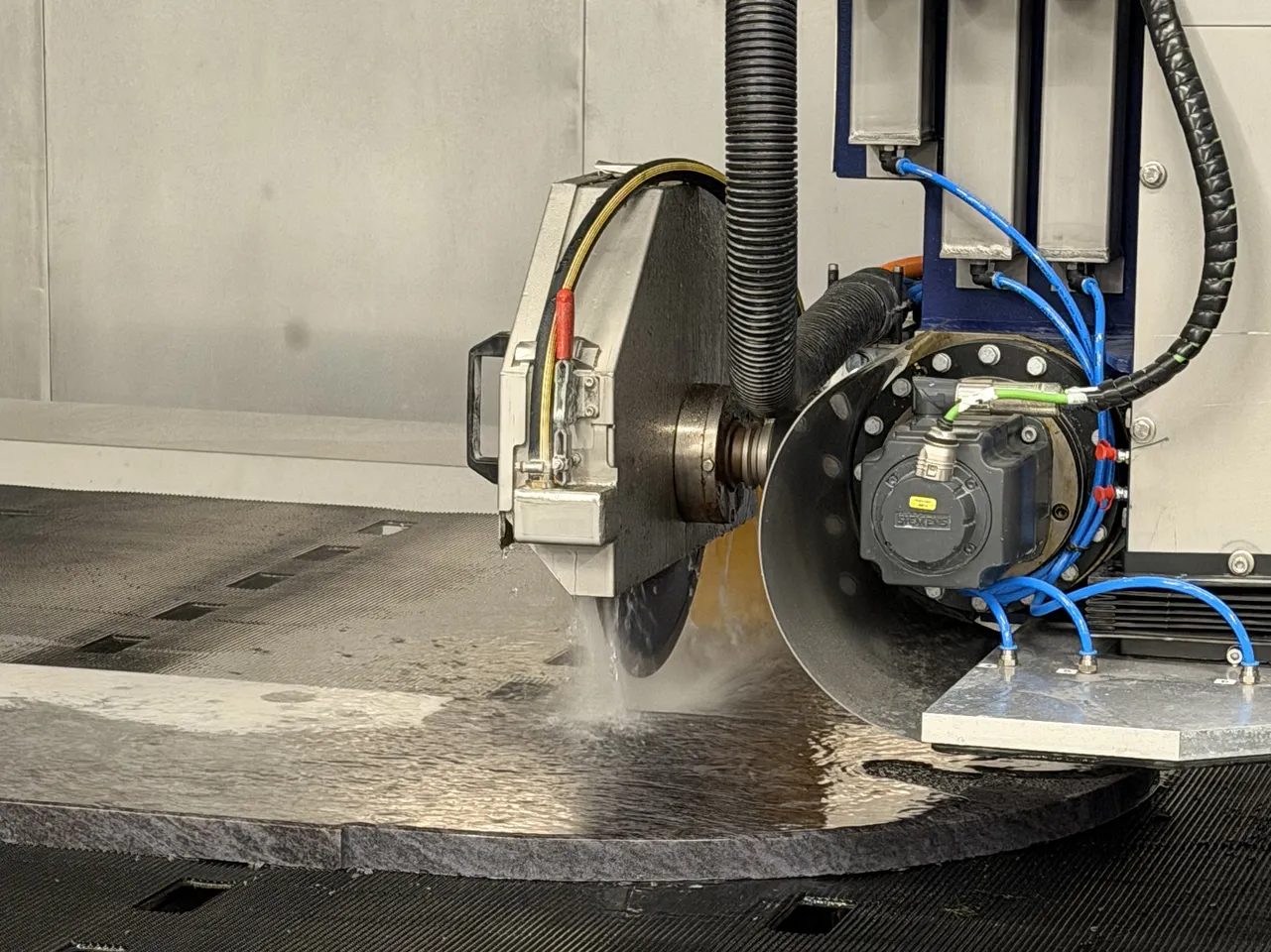 Investition in eine neue 5-Achs-Brückensäge mit automatischem Werkzeugwechsel (LDZ 2000) und Vakuumsauger zum Vereinzeln der Natursteine von Burkhardt & Löffler.