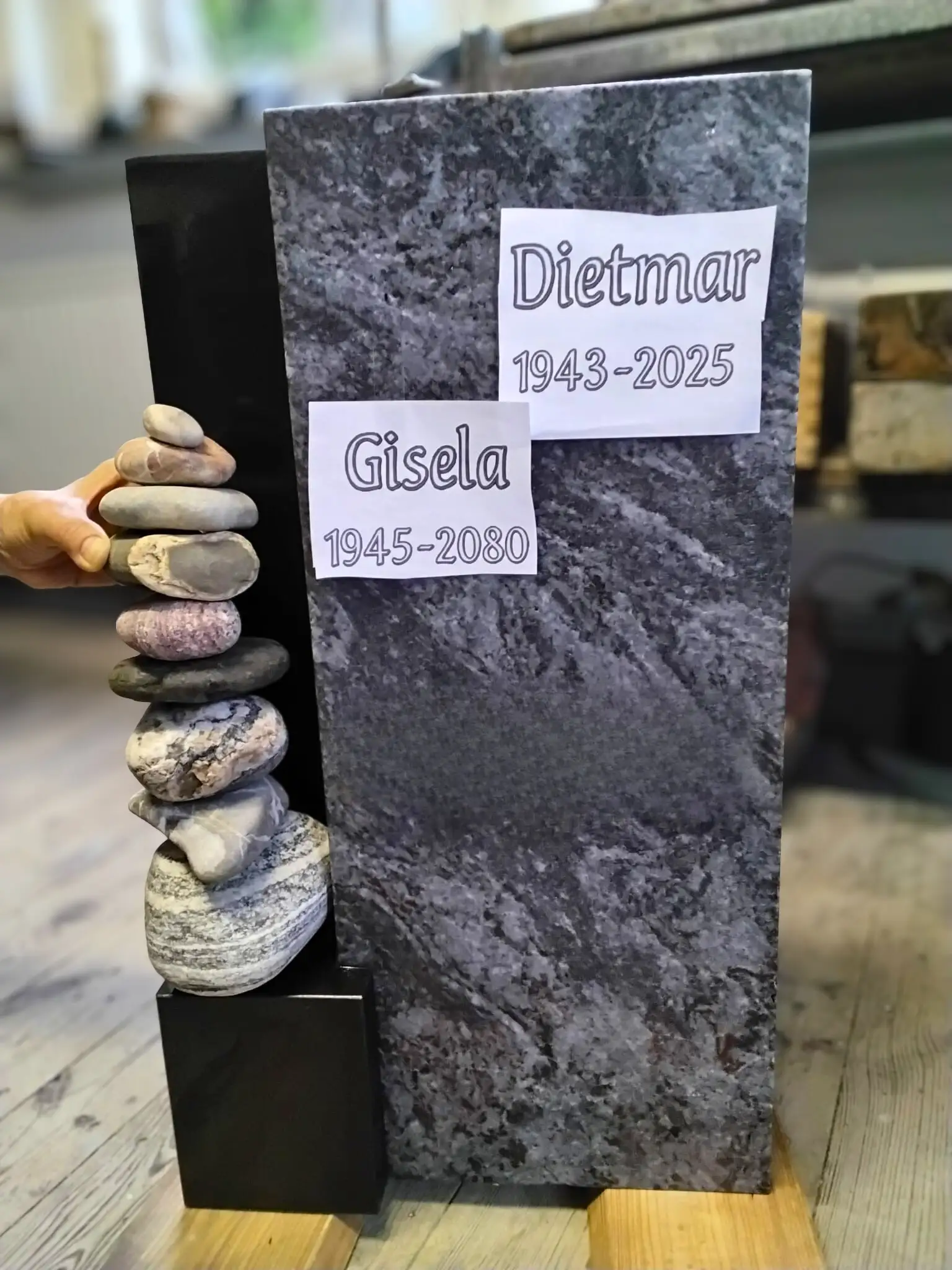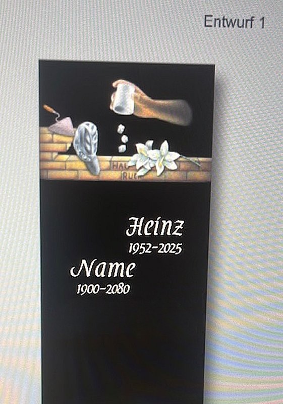 - Beschriftung: Nach der Bearbeitung des Steins erfolgt der Aufbau, damit wir die endgültige Beschriftung und Ornamentik besprechen können.