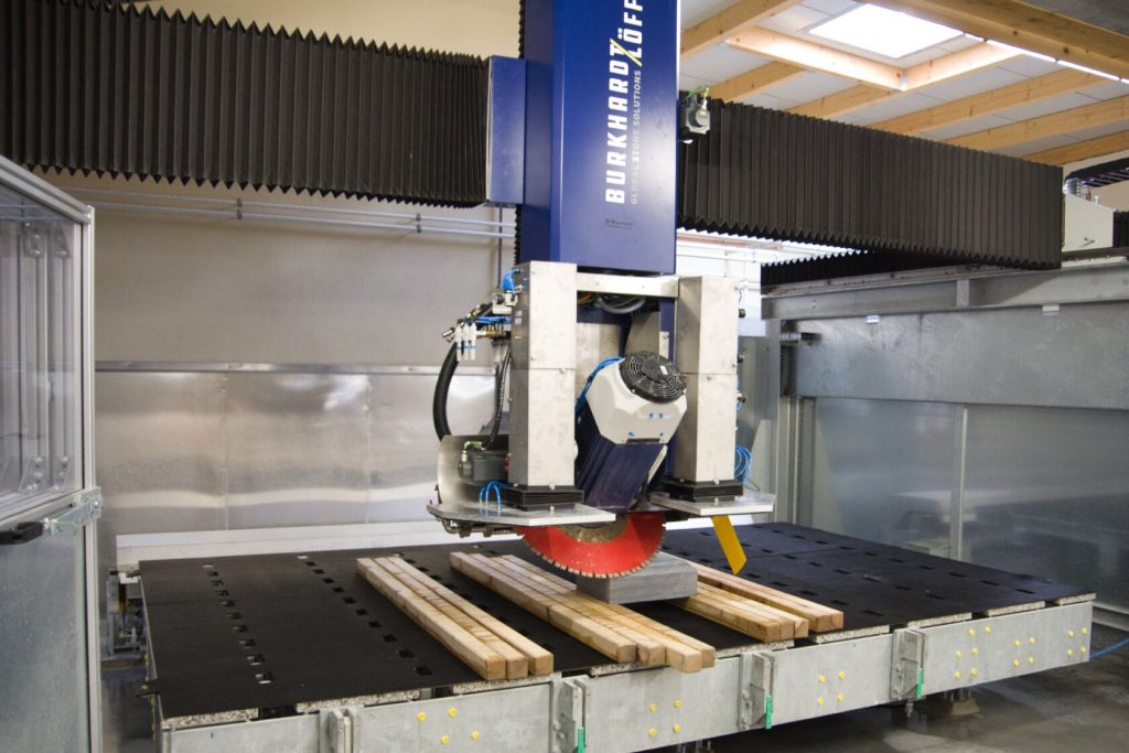 Investition in eine neue 5-Achs-Brückensäge mit automatischem Werkzeugwechsel (LDZ 2000) und Vakuumsauger zum Vereinzeln der Natursteine von Burkhardt & Löffler.